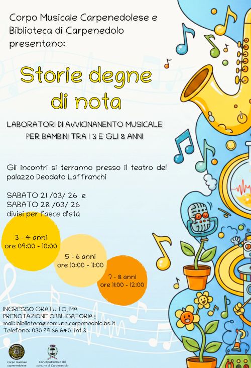 Sabato 21 e 28 marzo 2026 due laboratori di avvicinamento musicale per bambini tra i 3 e gli 8 anni, organizzati dalla Biblioteca e dal Corpo Musicale Carpenedolese
